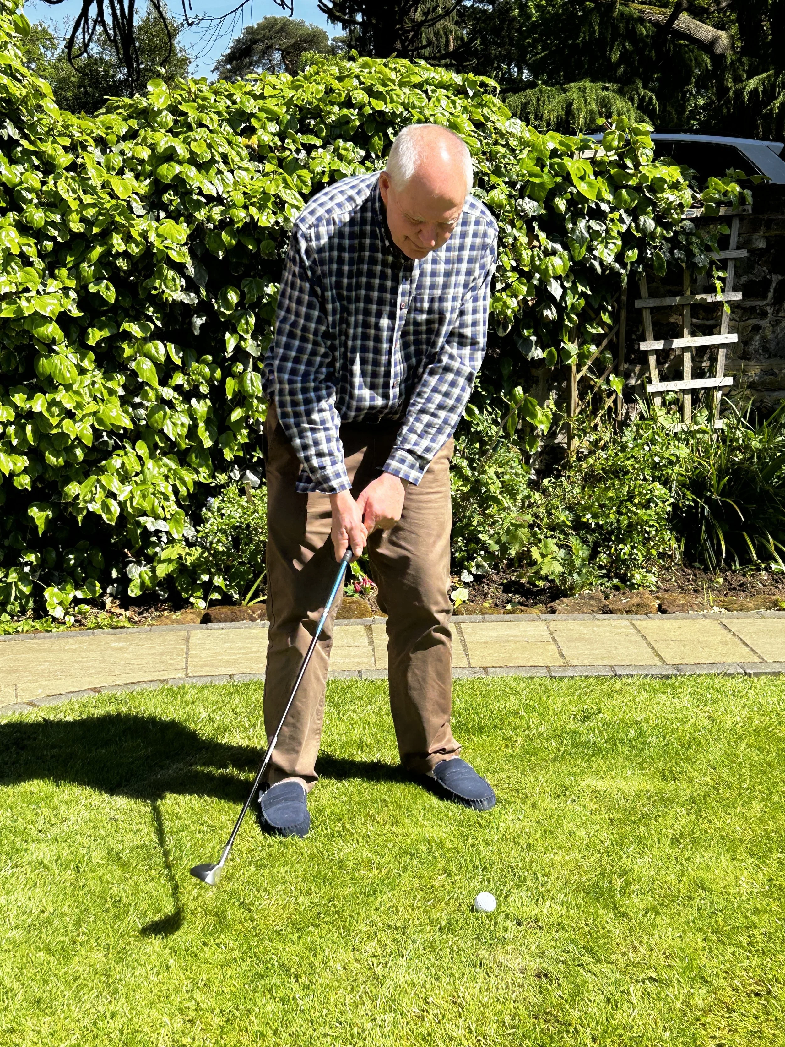 He is now able to manage all his personal care so no longer needs carers to help with this. He does his shopping, cooking, drives and has been able to return to travelling. We continue to work on improving his arm and hand function and this is him achieving his goal of being able to use a golf club so that he can go to crazy golf with his grandsons. The smile on his face says it all.